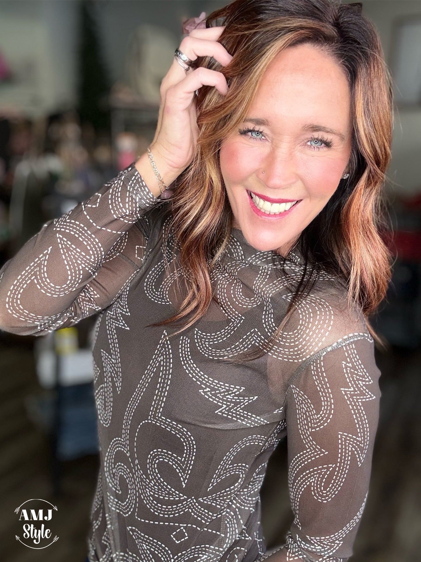 Introducing our Kick The Dust Up Top! The stretch is wonderful and so comfortable! This brown mesh top features a high collar and unique white boot stitching print, making it a playful and stylish addition to any wardrobe. Perfect for those who like to kick up their fashion game (and their boots.)