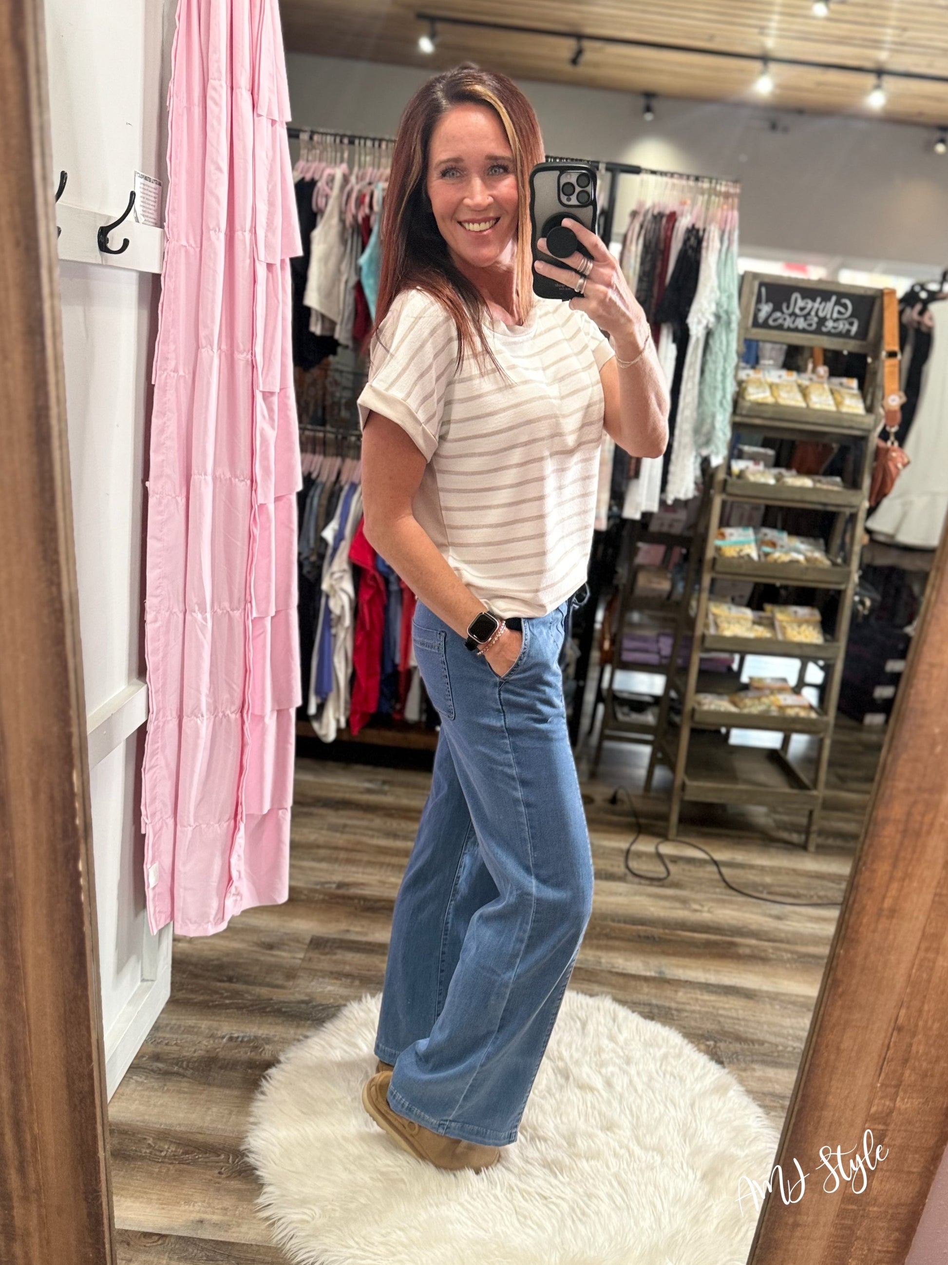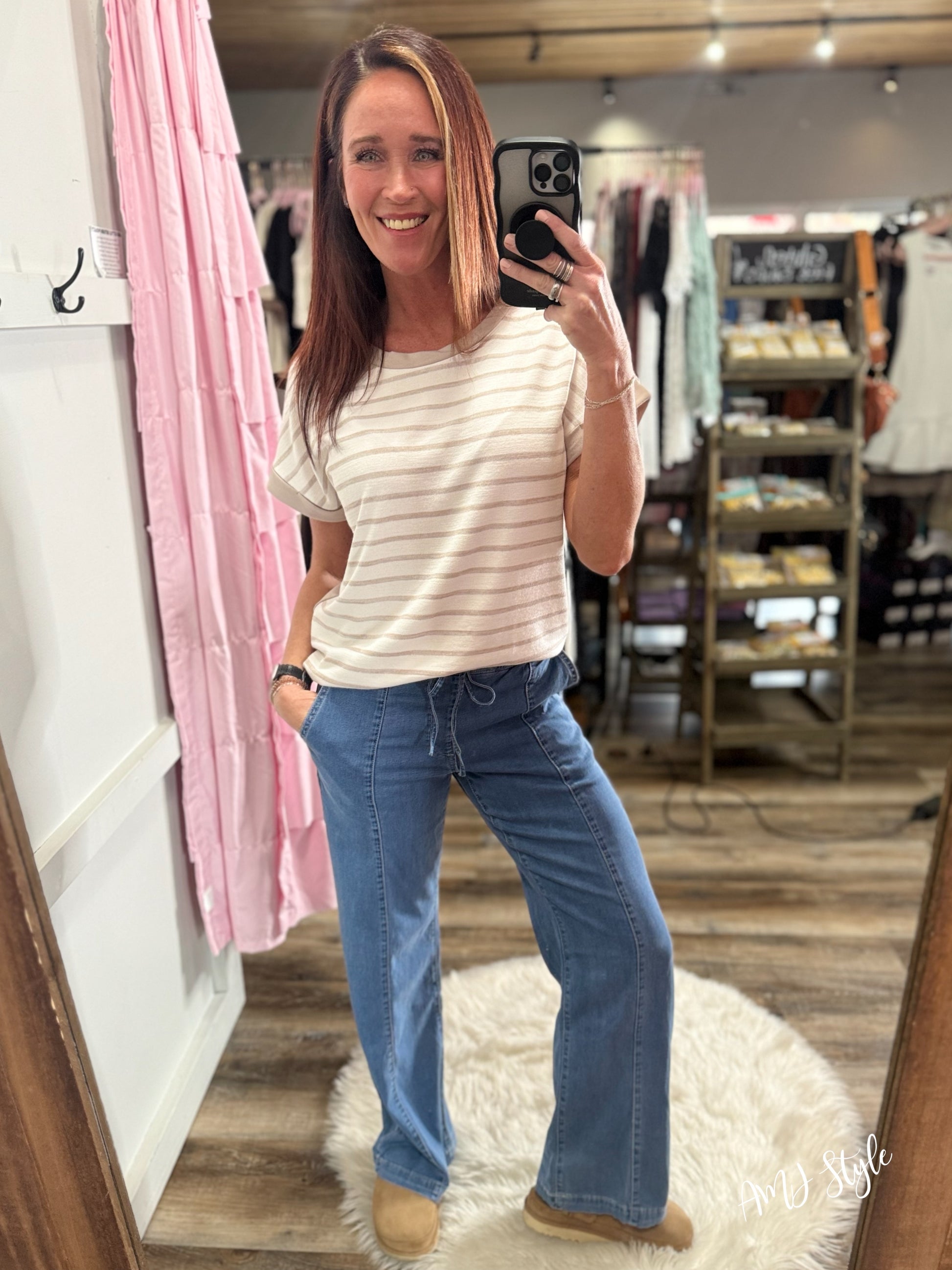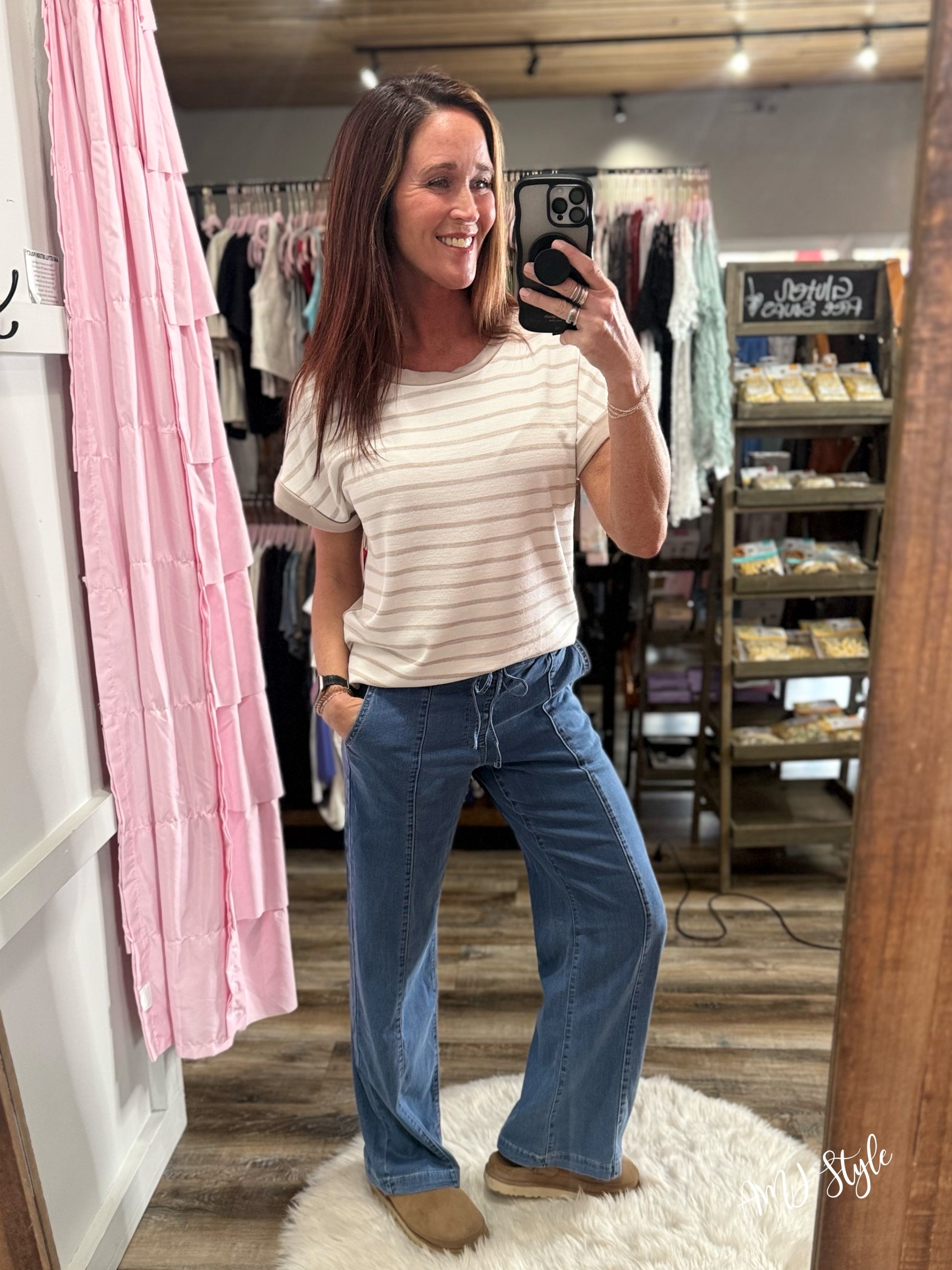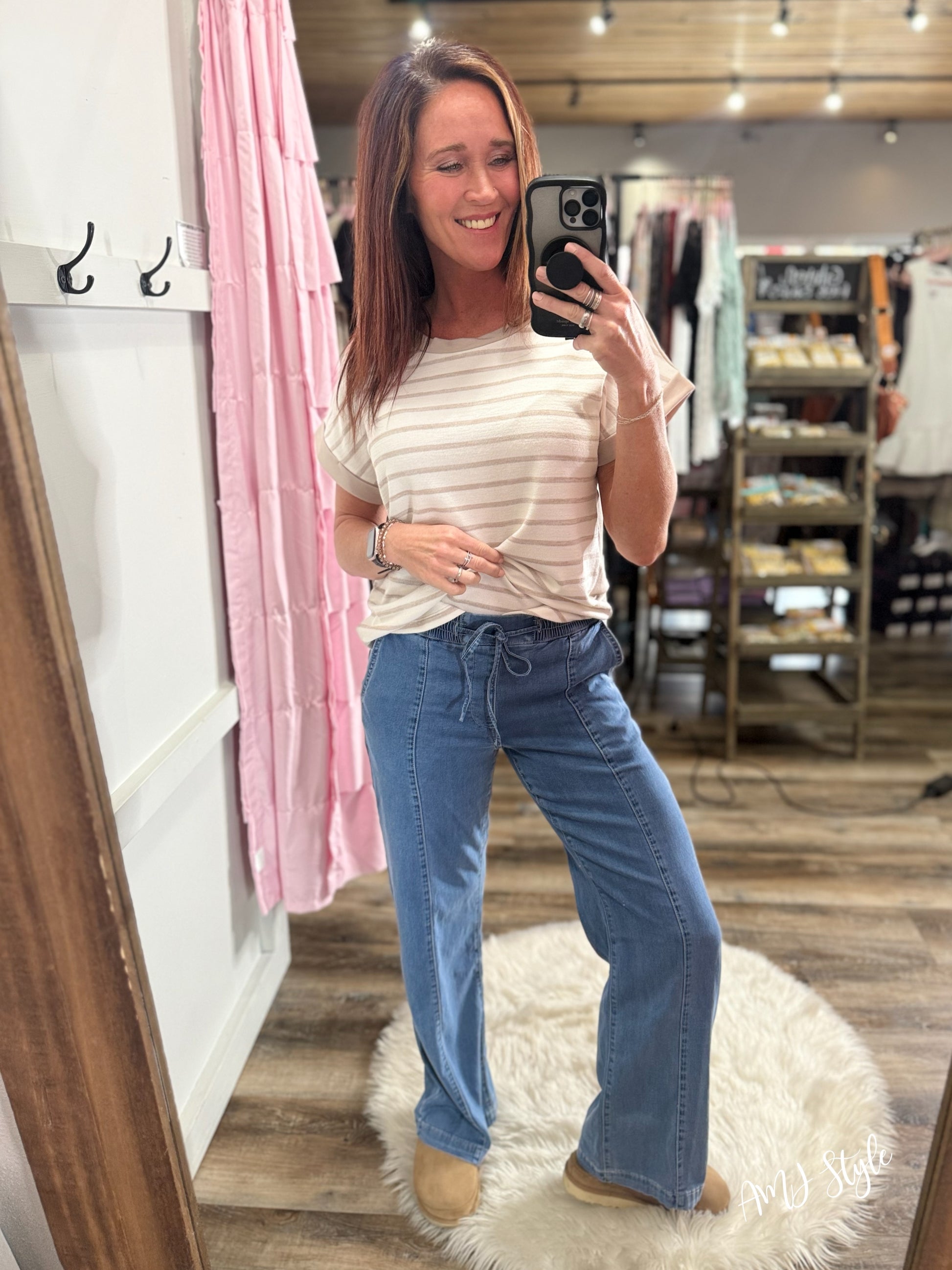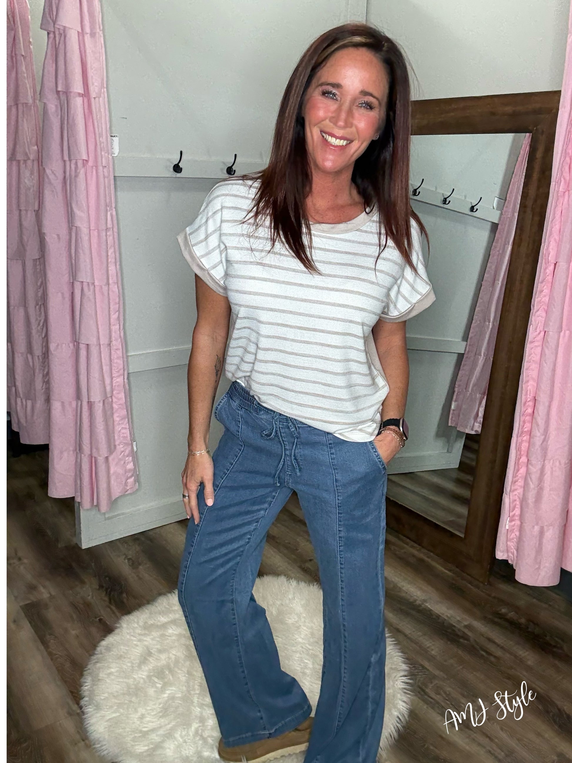 Effortless style meets comfort in these Metro Ease Denim Joggers. Designed with a high-rise fit and wide leg silhouette, they feature a lightweight, flowy fabric that moves with you. The elastic waistband with tie closure ensures a customizable fit, while functional pockets keep your essentials within reach. Perfect for casual outings, work-from-home days, or weekend adventures—these joggers transition seamlessly from day to night.