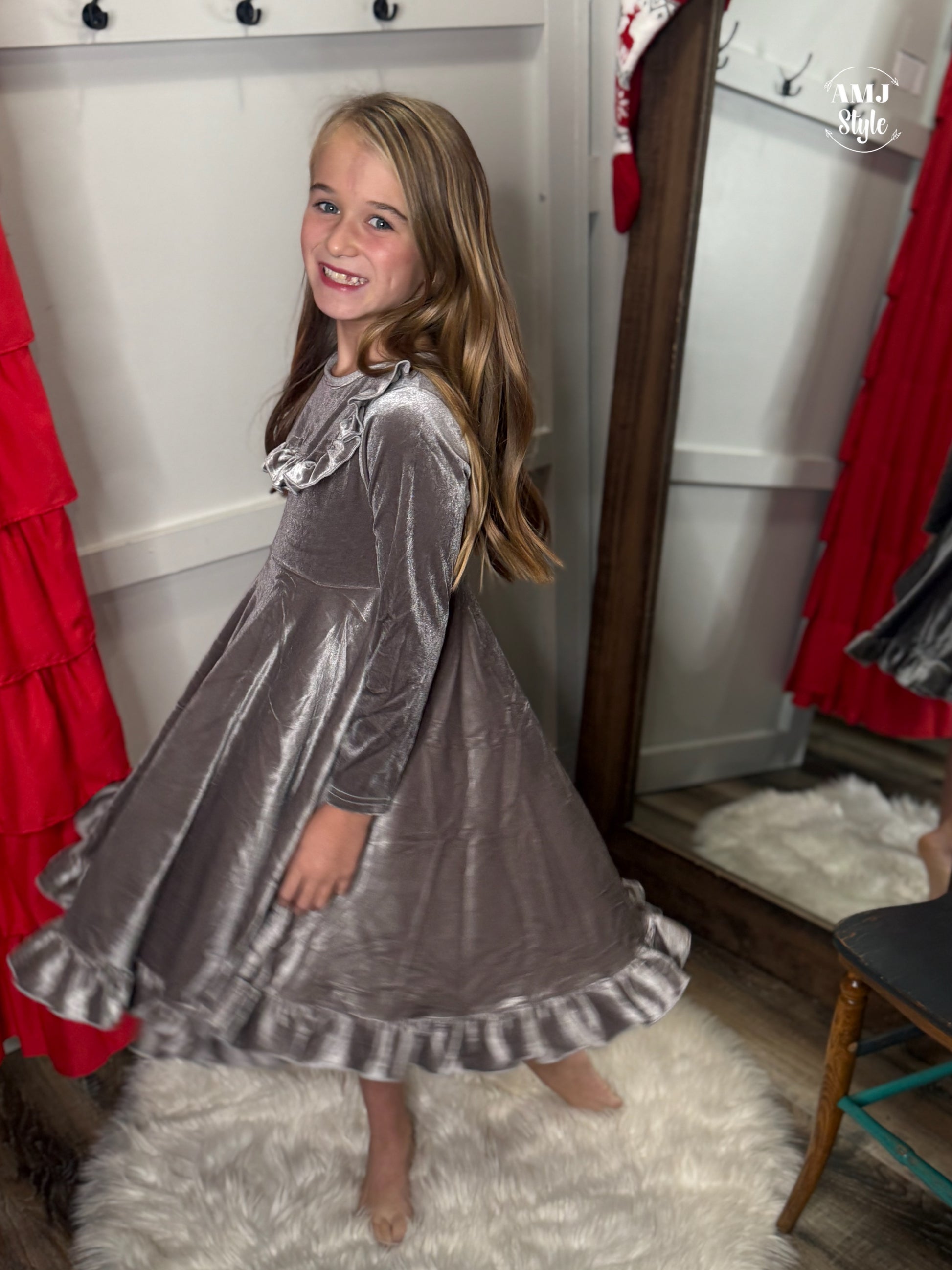 Let your little one shine at holiday celebrations in this enchanting Silver Ice Velvet Kiddo Dress! Crafted from luxuriously soft gray-silver velvet, this long-sleeve beauty features delicate ruffle detailing at the bib and a charming keyhole cutout on the back for that extra touch of elegance. Perfect for winter parties, Christmas gatherings, and special occasions, it's designed to make her feel like the star of the show. The sophisticated velvet fabric paired with playful ruffles strikes the ideal balance between fancy and fun—ideal for creating magical holiday memories!