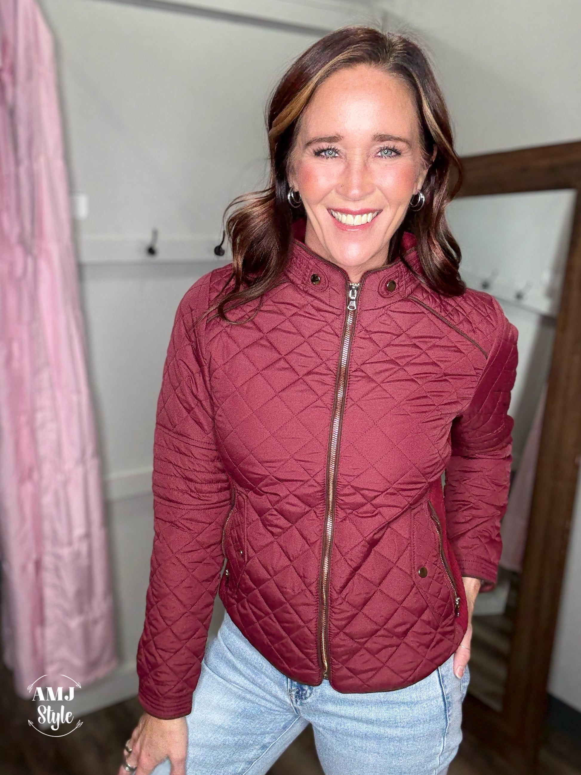 Elevate your layering game with this wine-hued quilted jacket that's equal parts cozy and chic. Featuring suede piping details, a functional front pocket, and flattering side ribs, it's designed to hug your silhouette just right. The quilted padding keeps you warm without the bulk, while the 100% polyester fabric makes it easy to care for. Perfect for those days when you want to look put-together without trying too hard!