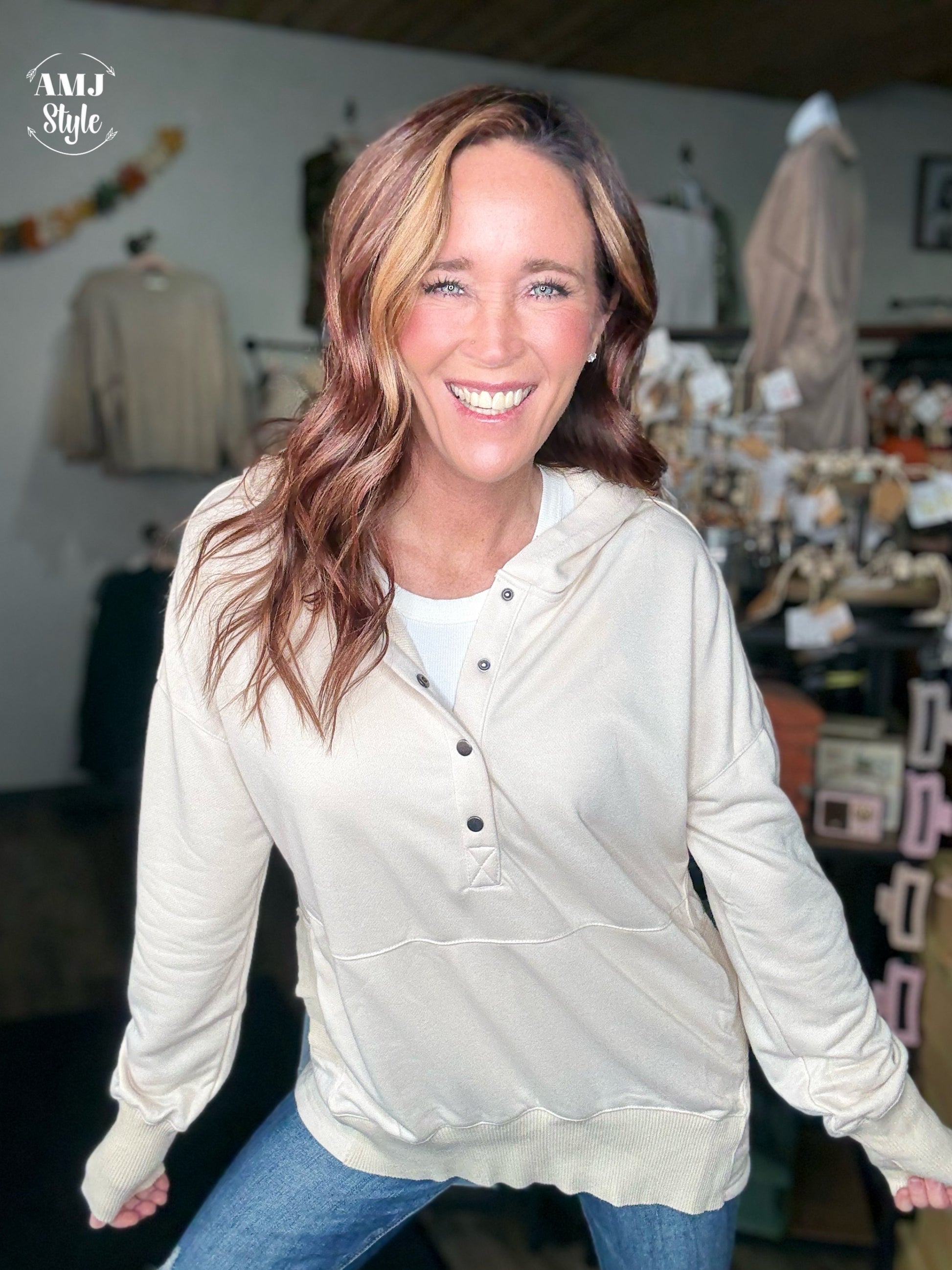 Wrap yourself in cozy comfort with this oversized drop shoulder half button-up knit hoodie. Its relaxed fit and soft knit fabric make it perfect for lounging or casual outings. The half button closure adds a playful touch, making it easy to layer and style. So good, you'll want to wear it everywhere!