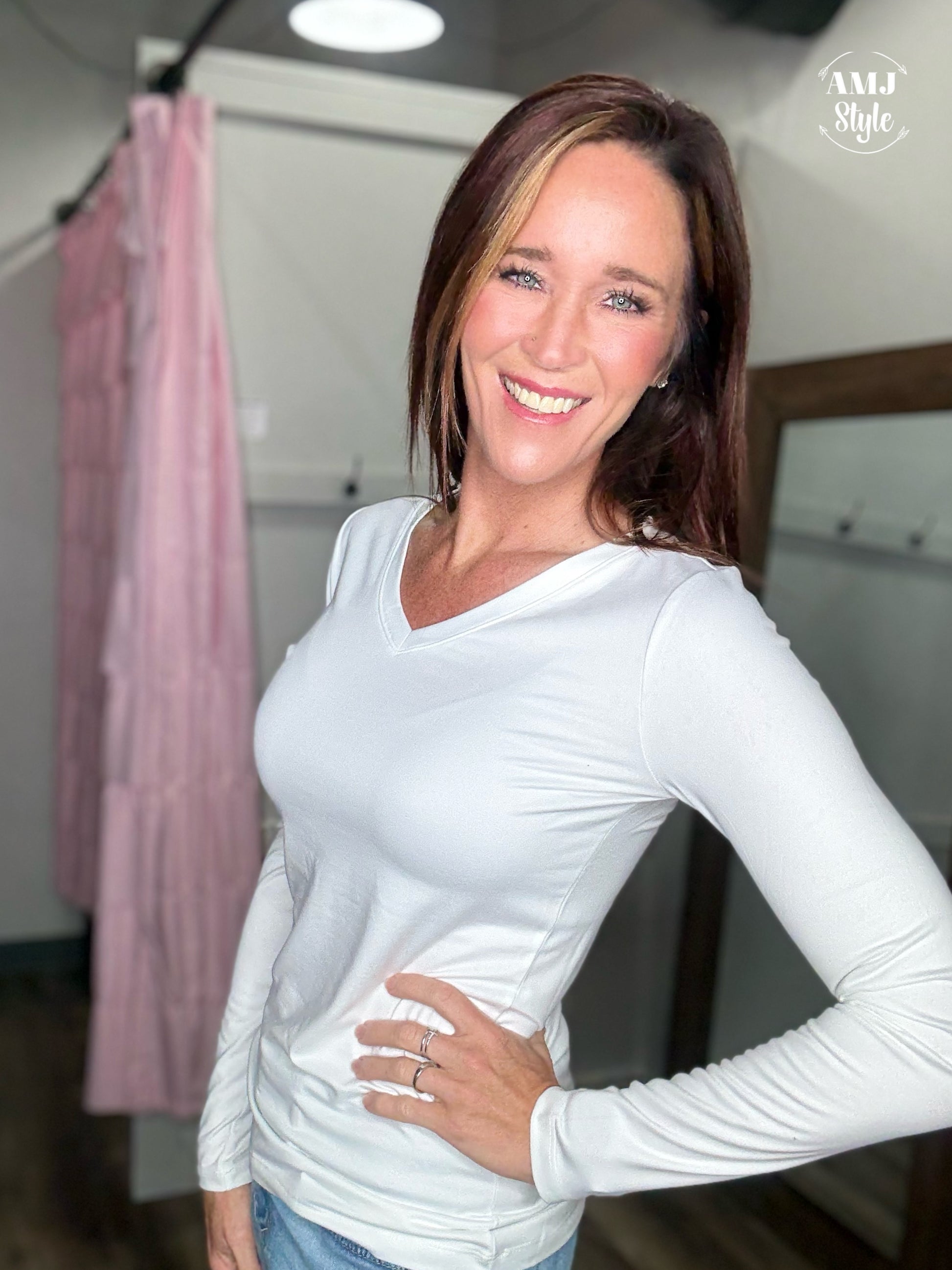 Experience cozy comfort with The Perfect Long Sleeve Tee with a V Neck line. Crafted from brushed microfiber, it feels buttery soft against your skin while keeping you warm. Its perfect stretch and recovery ensure a snug fit that moves with you all day. The best layering style! So soft, you'll want to wear it everywhere!