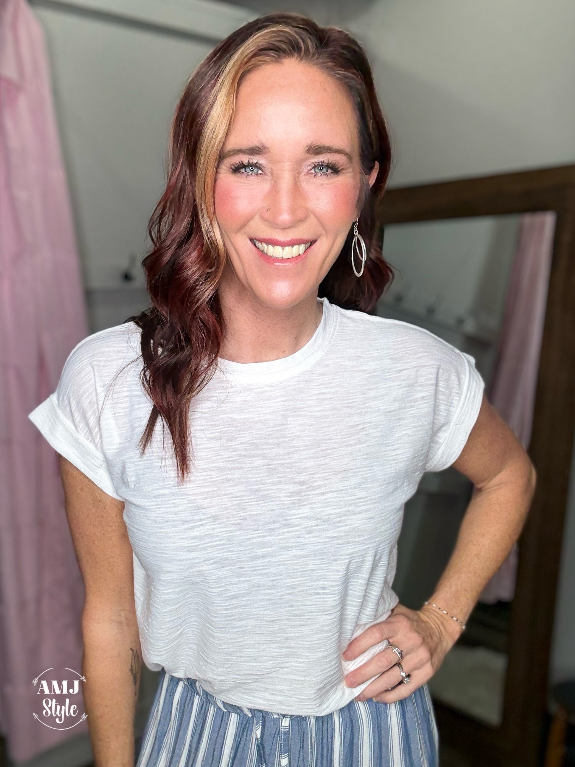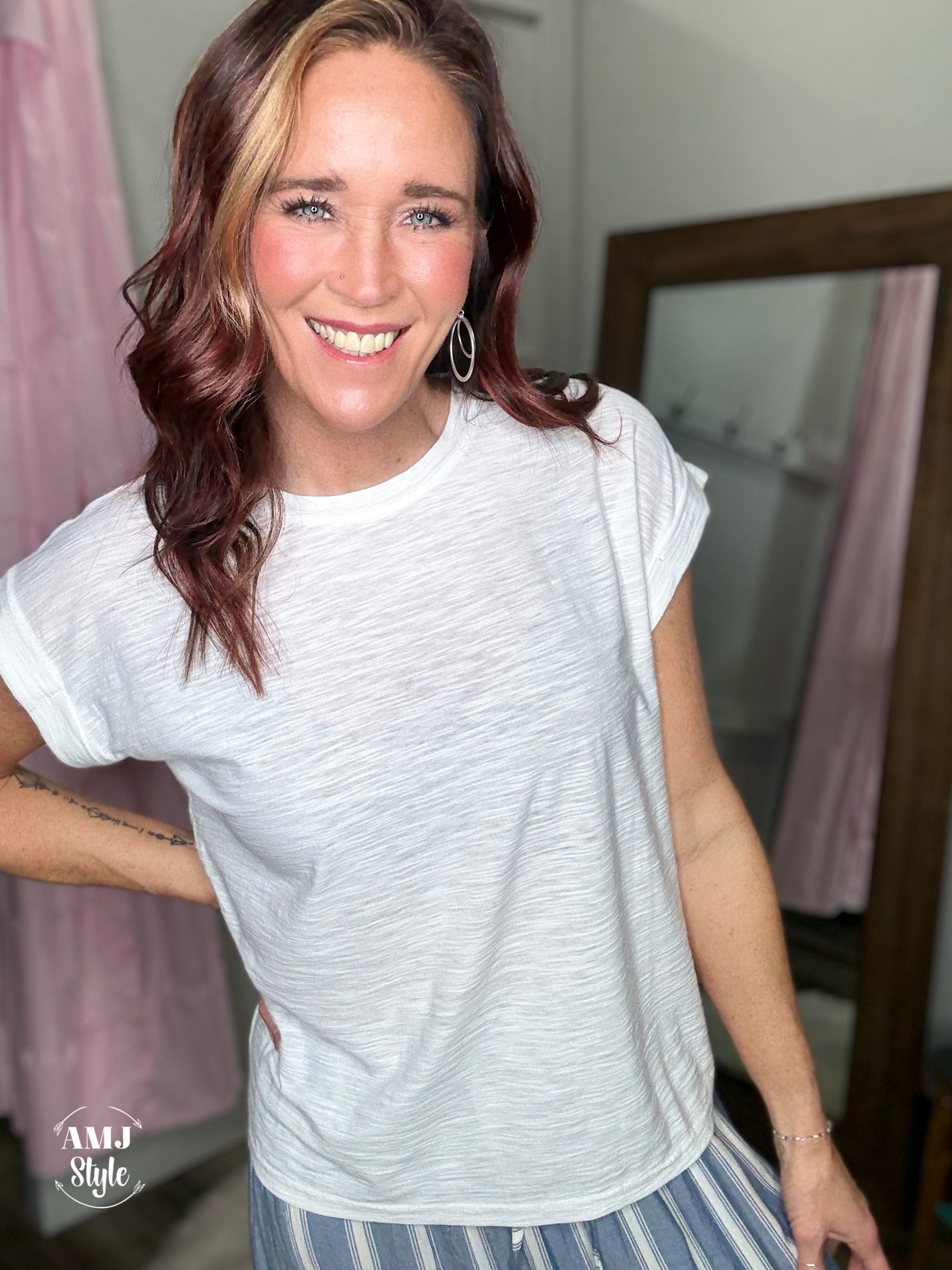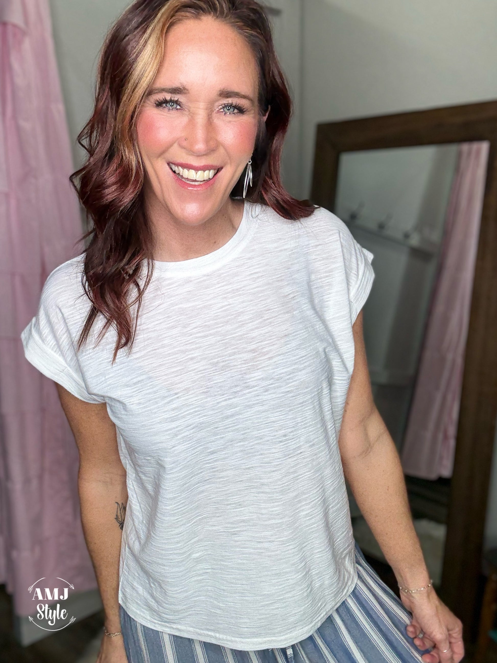 Introducing the Serenity Tee, your new go-to for softness and style. This tee features a comfortable cotton modal slub fabric, rolled sleeves, and a flattering fit. Tired of boring basic tees? Upgrade to this roomie (and non see-through) option!